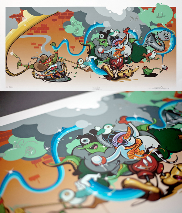 Open timed edition (edition quantity will be set after sale closes) Giclee print on Museo Portfolio Rag paper (printed with Epson HDR Ultrachrome Ink) Hand-signed, numbered and embellished by each artist 12″ x 24″ $50 each or $125 including optional frame (price does not include s&h) To see more images of the actual mural coming together click HERE