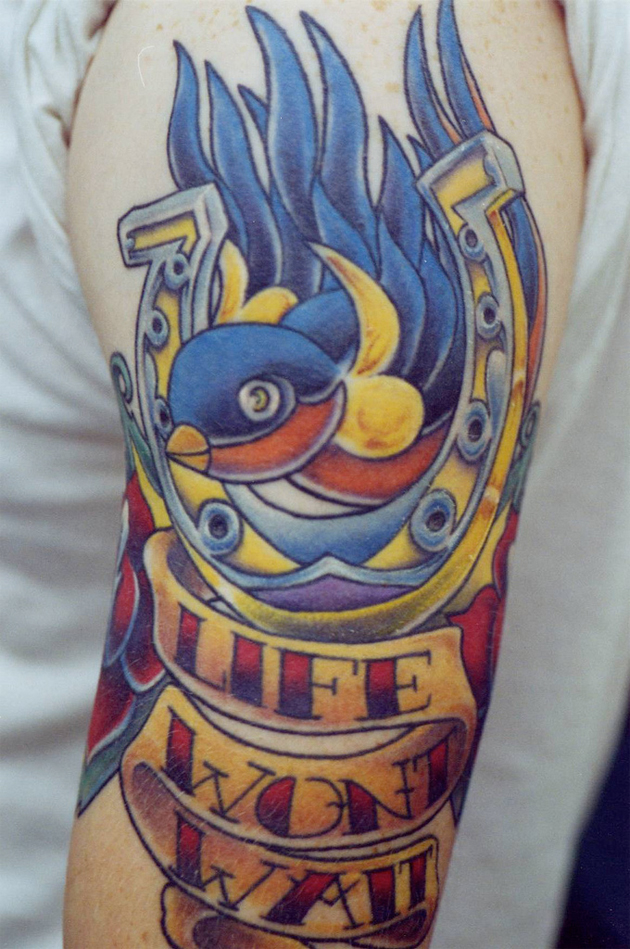 Tuesday, October 26, 2010For this week’s Tattoo Tuesday we’ve featured this tattoo of a bird with a golden horseshoe and a banner that reads “Life Won’t Wait”. The tattoo was done by the tattoo artist Kent McKnight.
